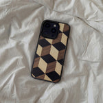 Coque de protection en bois véritable fabriquée en France pour iPhone 16 Plus alliant plusieurs essences de bois pour représenter un classique intemporel de la marqueterie