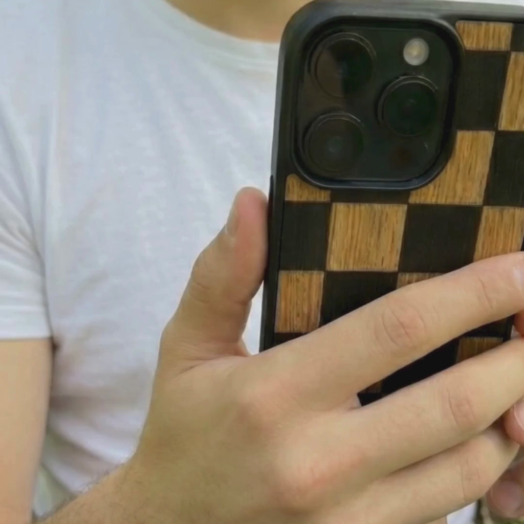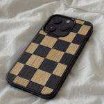Coque de protection en bois véritable fabriquée en France pour iPhone 16 Plus alliant plusieurs essences de bois pour représenter un damier