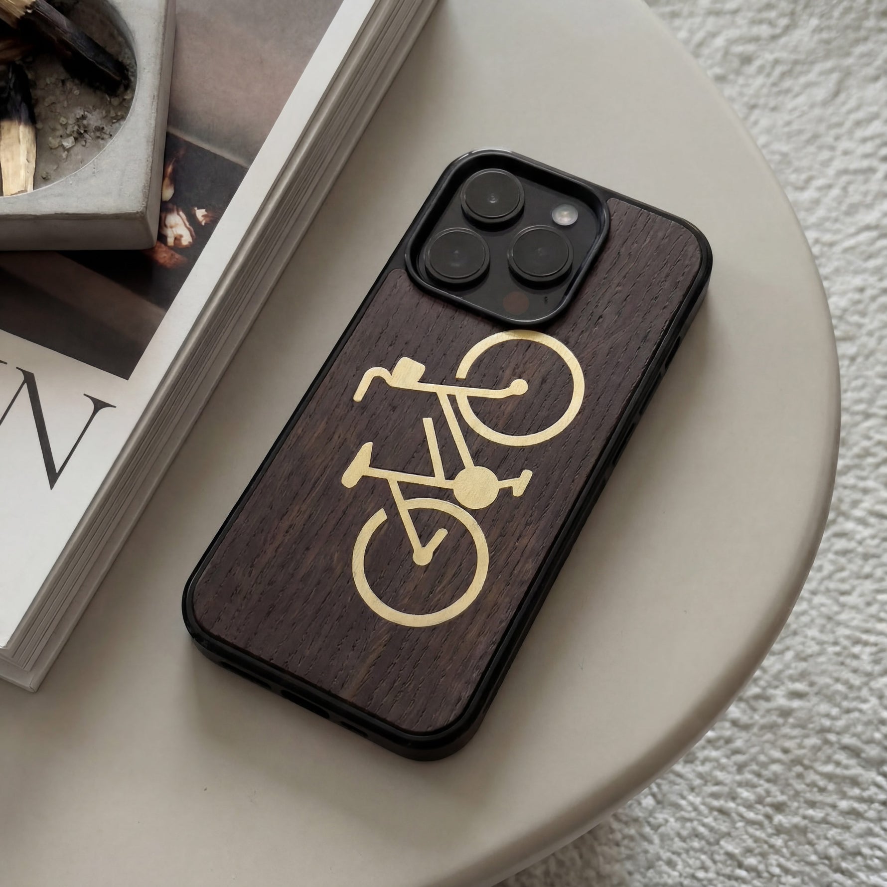 Coque de protection en bois véritable fabriquée en France pour iPhone 16 Plus sur le theme du vélo et de l'outdoor qui allie du bambou et du chêne fumé représentant un vélo