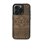 Coque de protection en bois véritable fabriquée en France pour iPhone 16 Pro + MagSafe® avec des motifs géométriques s'inspirant des temples aztèques, mayas et incas