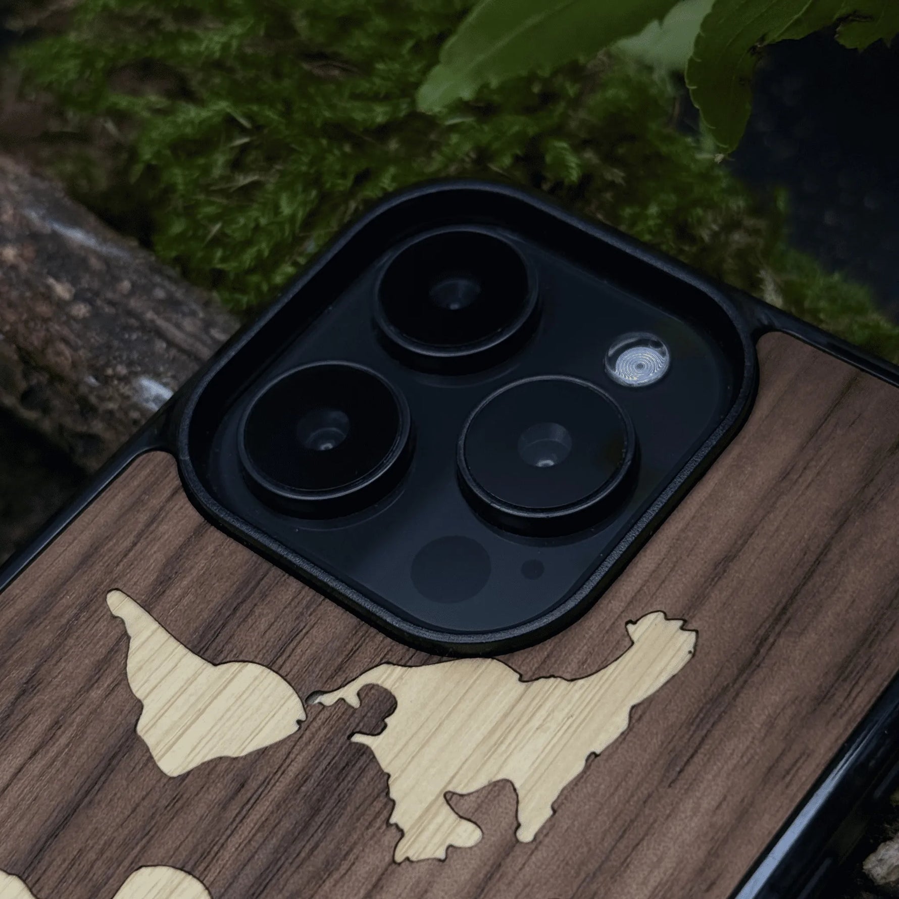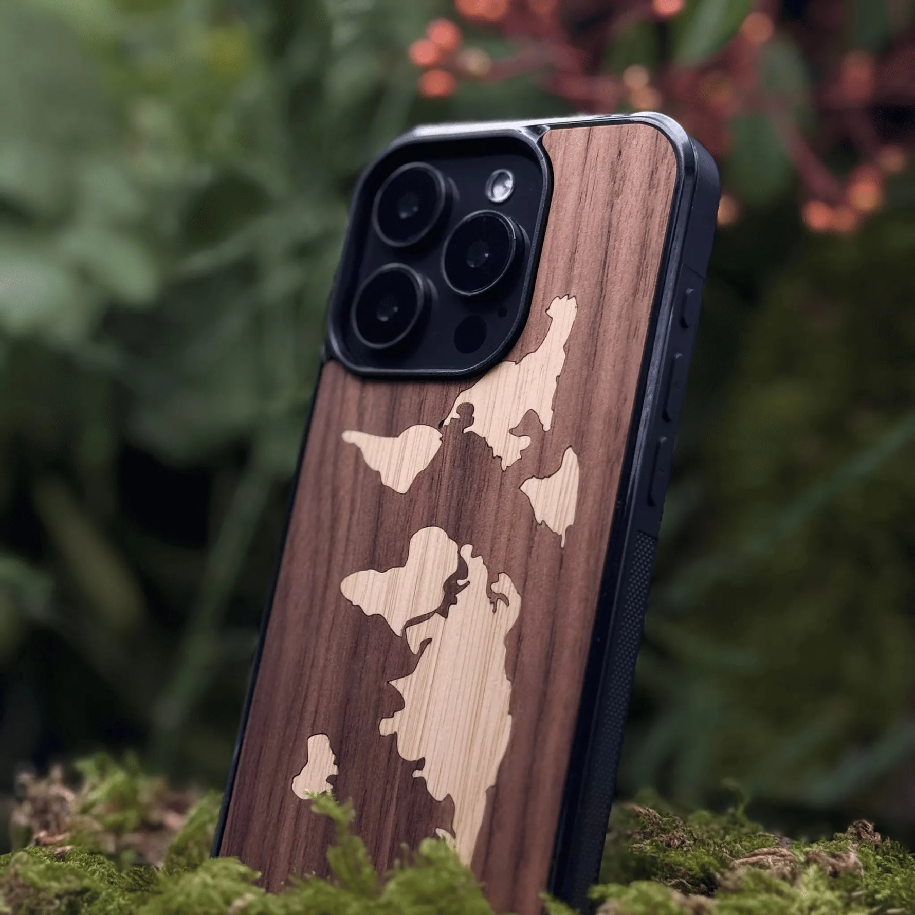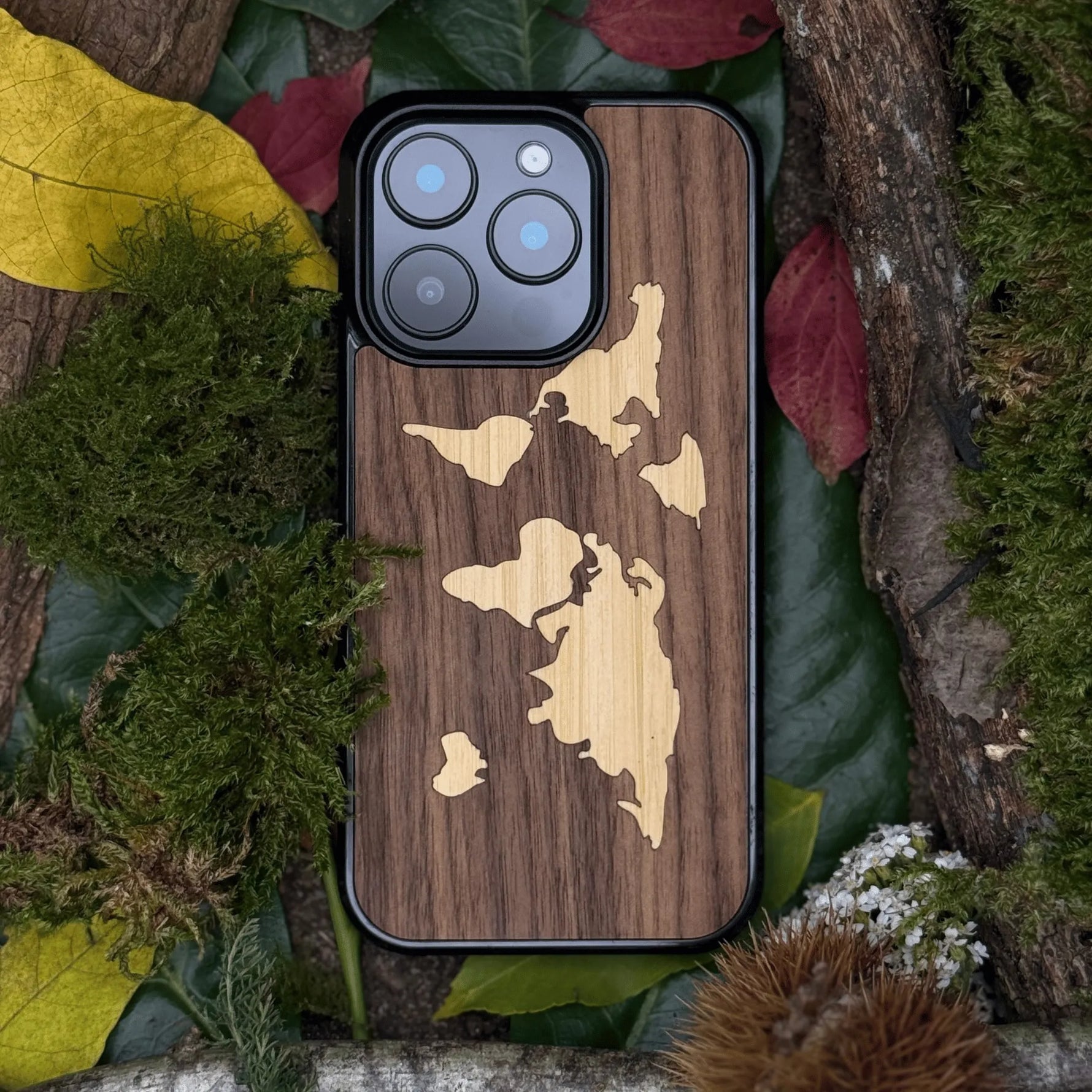 Coque de protection en bois véritable fabriquée en France pour iPhone 17 alliant du bambou et du noyer sur le thème du voyage et de l'aventure représentant une mappemonde