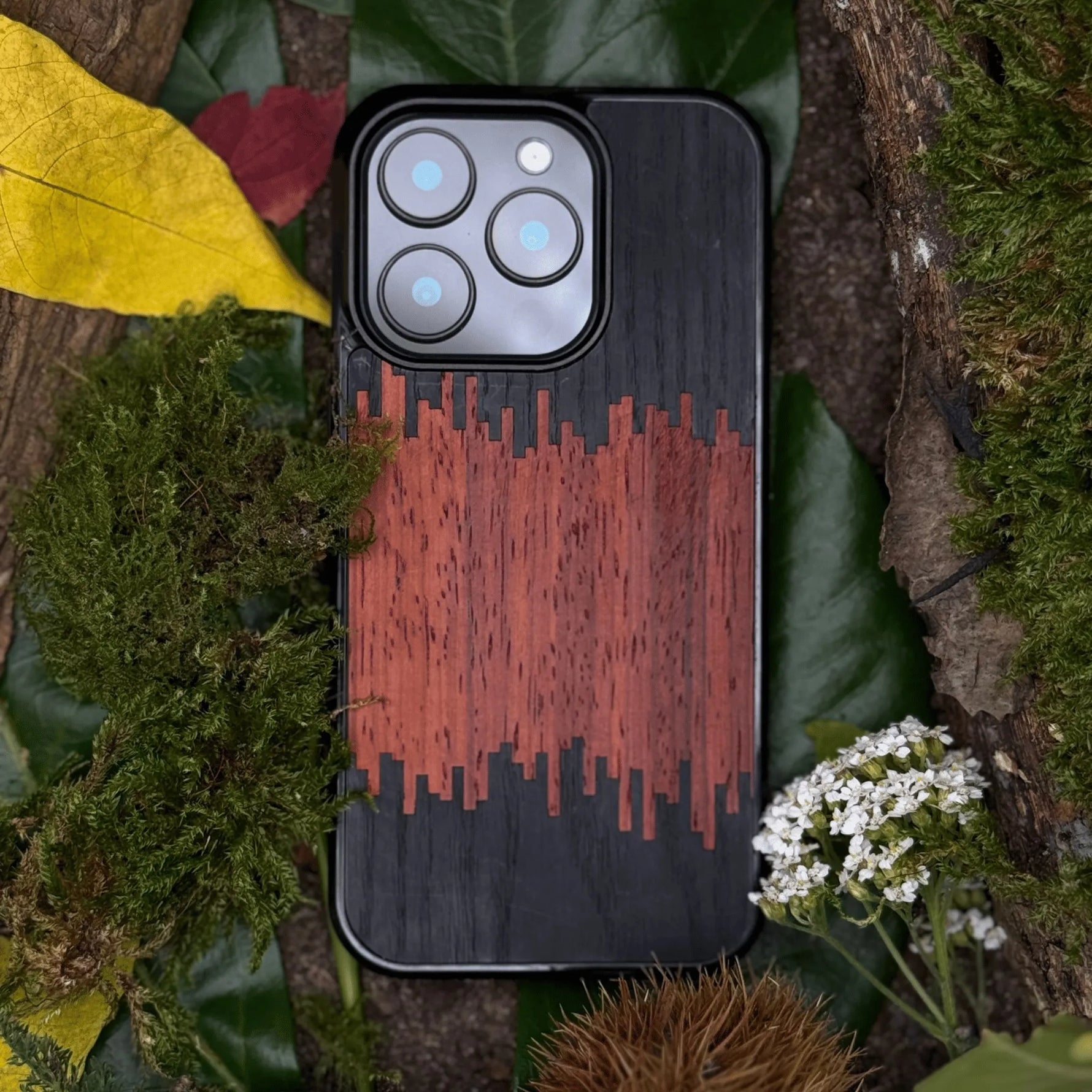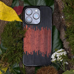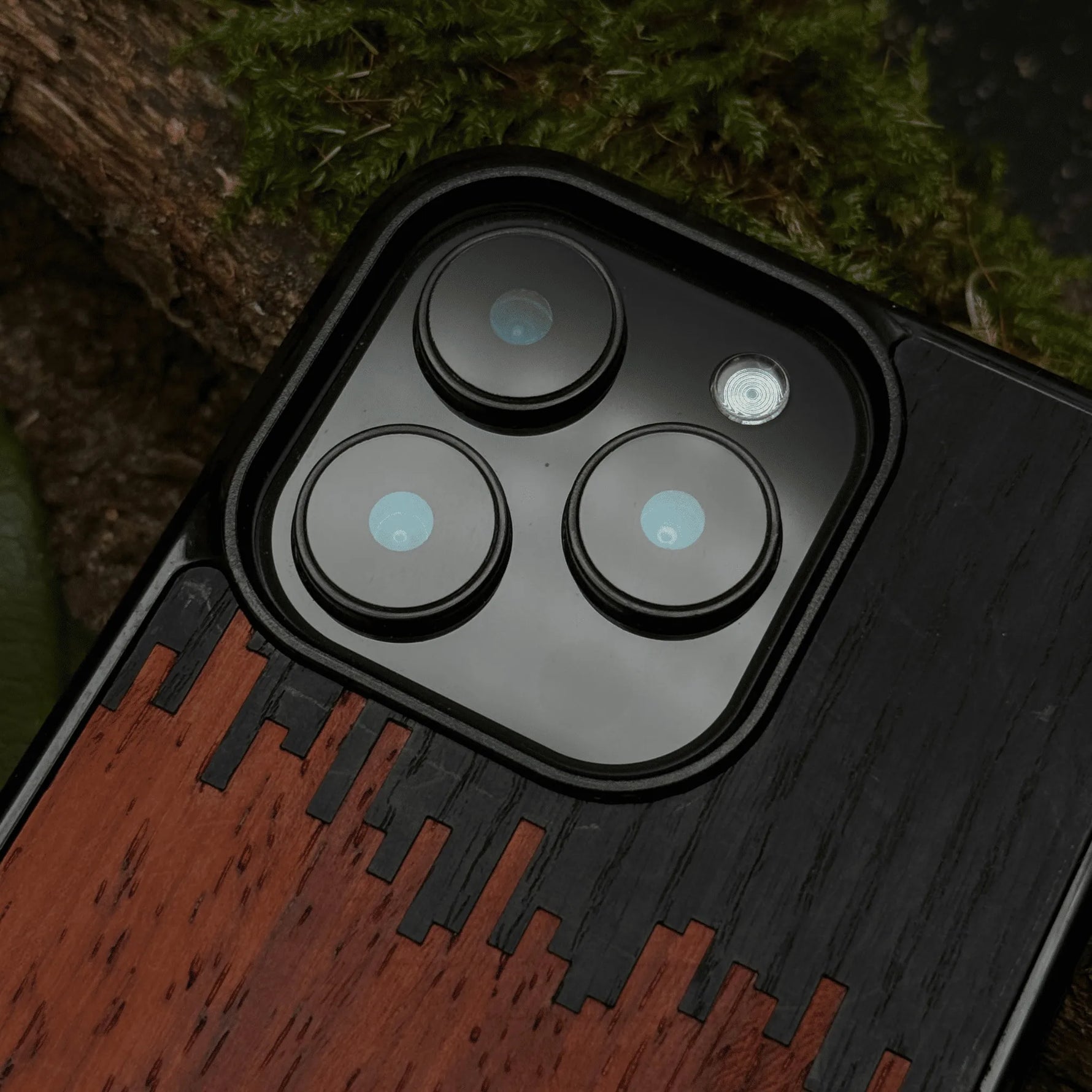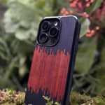 Coque de protection en bois véritable fabriquée en France pour iPhone 17 Pro Max alliant plusieurs essences de bois pour représenter du magma en fusion