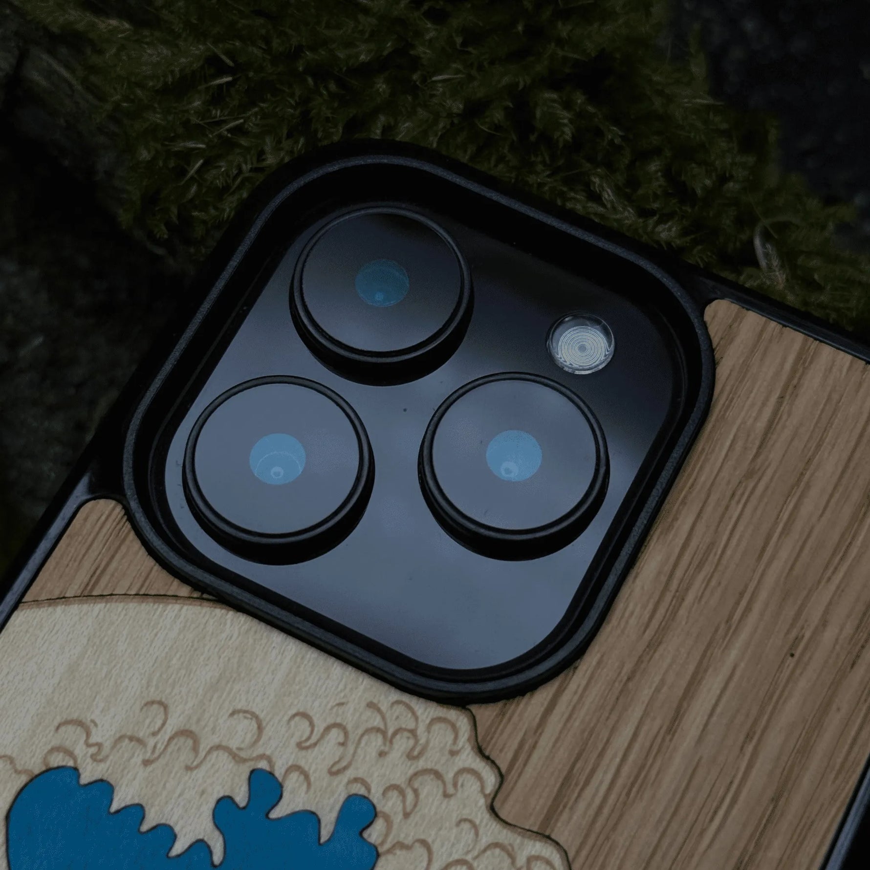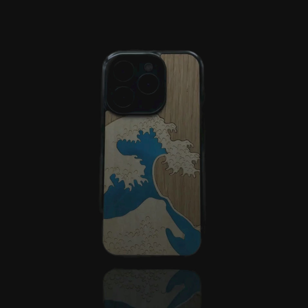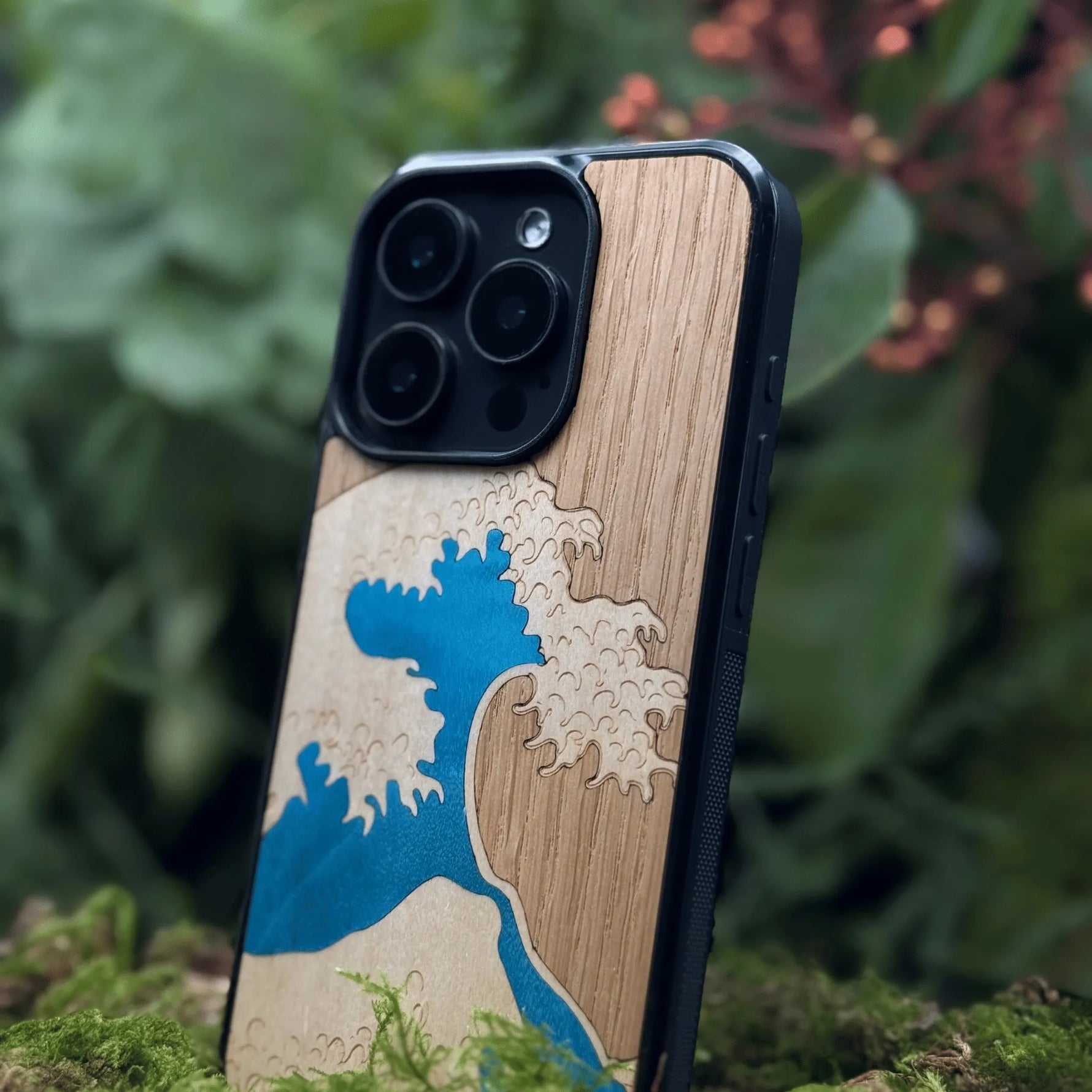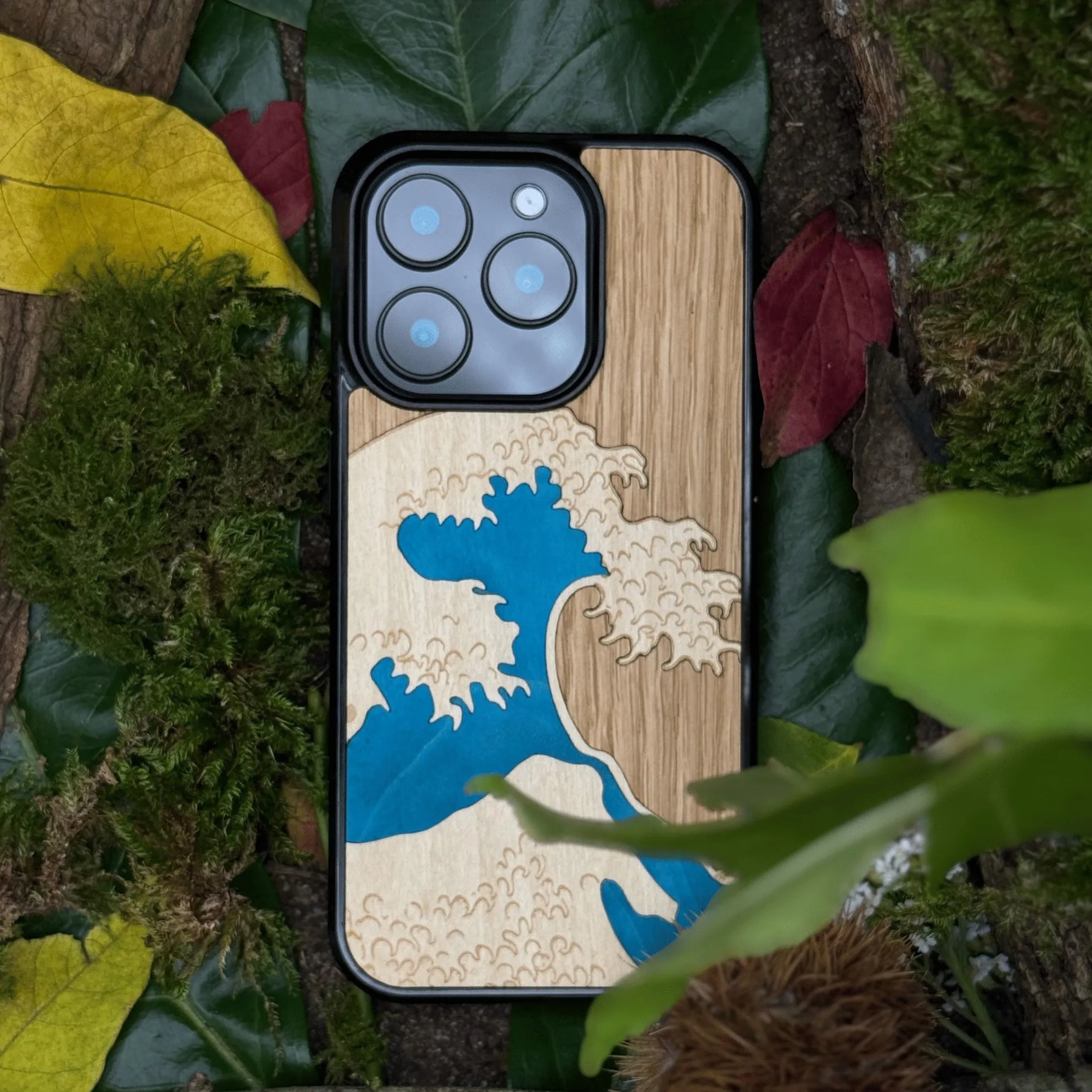 Coque de protection en bois véritable fabriquée en France pour iPhone XS alliant plusieurs essences de bois pour représenter la célèbre grande vague de Kanagawa