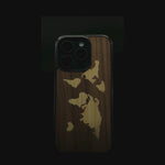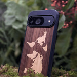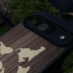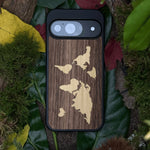 Coque de protection en bois véritable fabriquée en France pour Google Pixel 10 alliant du bambou et du noyer sur le thème du voyage et de l'aventure représentant une mappemonde