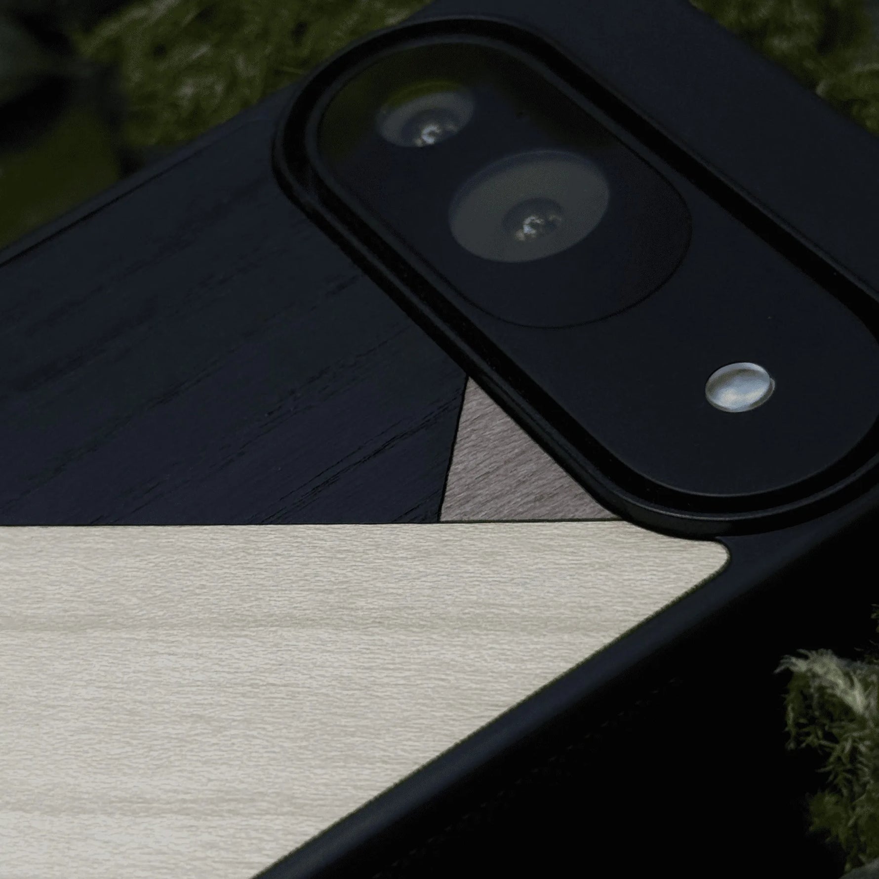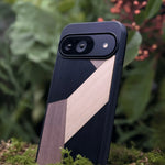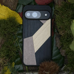 Coque de protection en bois véritable fabriquée en France pour Google Pixel 7a alliant du bambou, du tulipier mauve et noir en forme de mosaïque minimaliste sur le thème de l'art abstrait