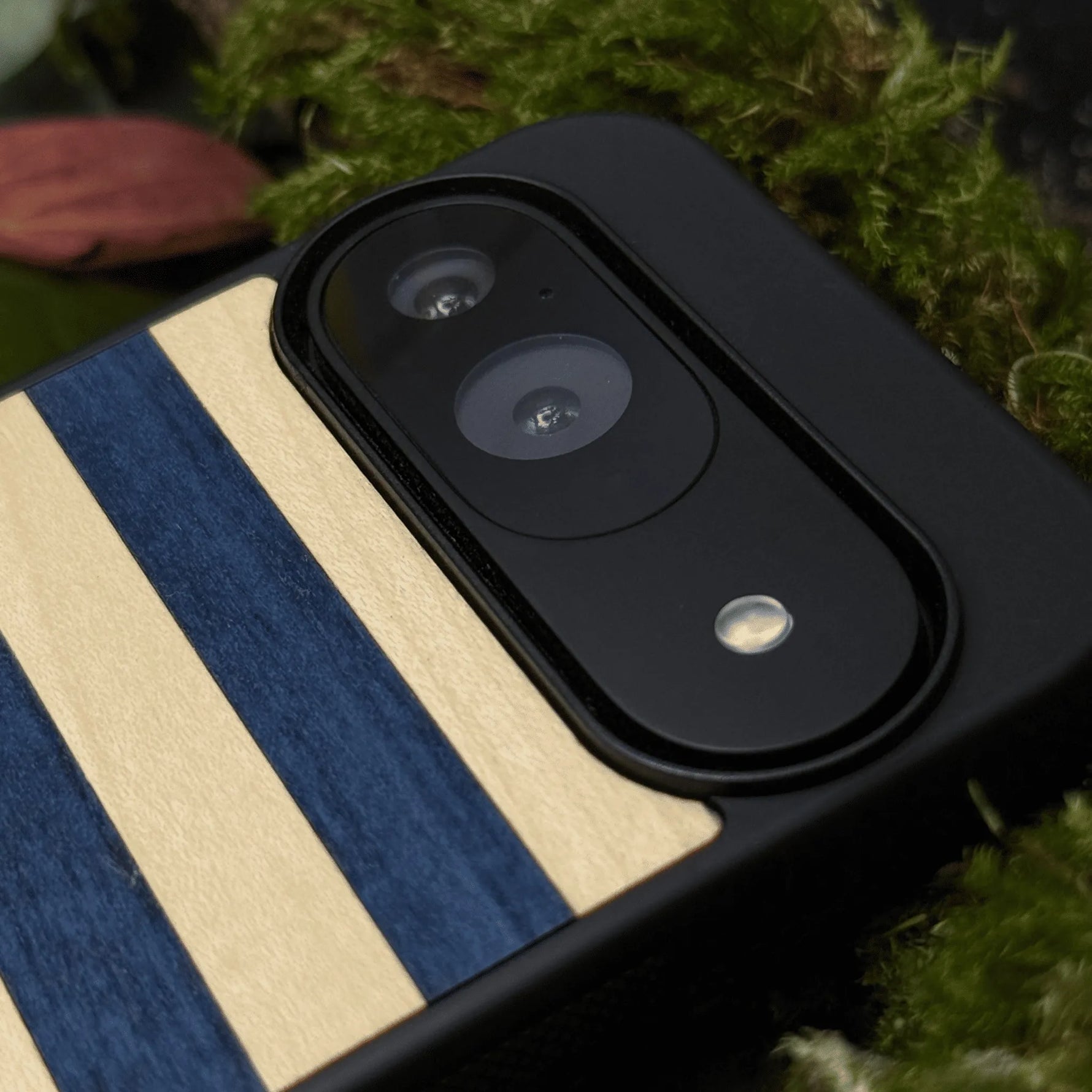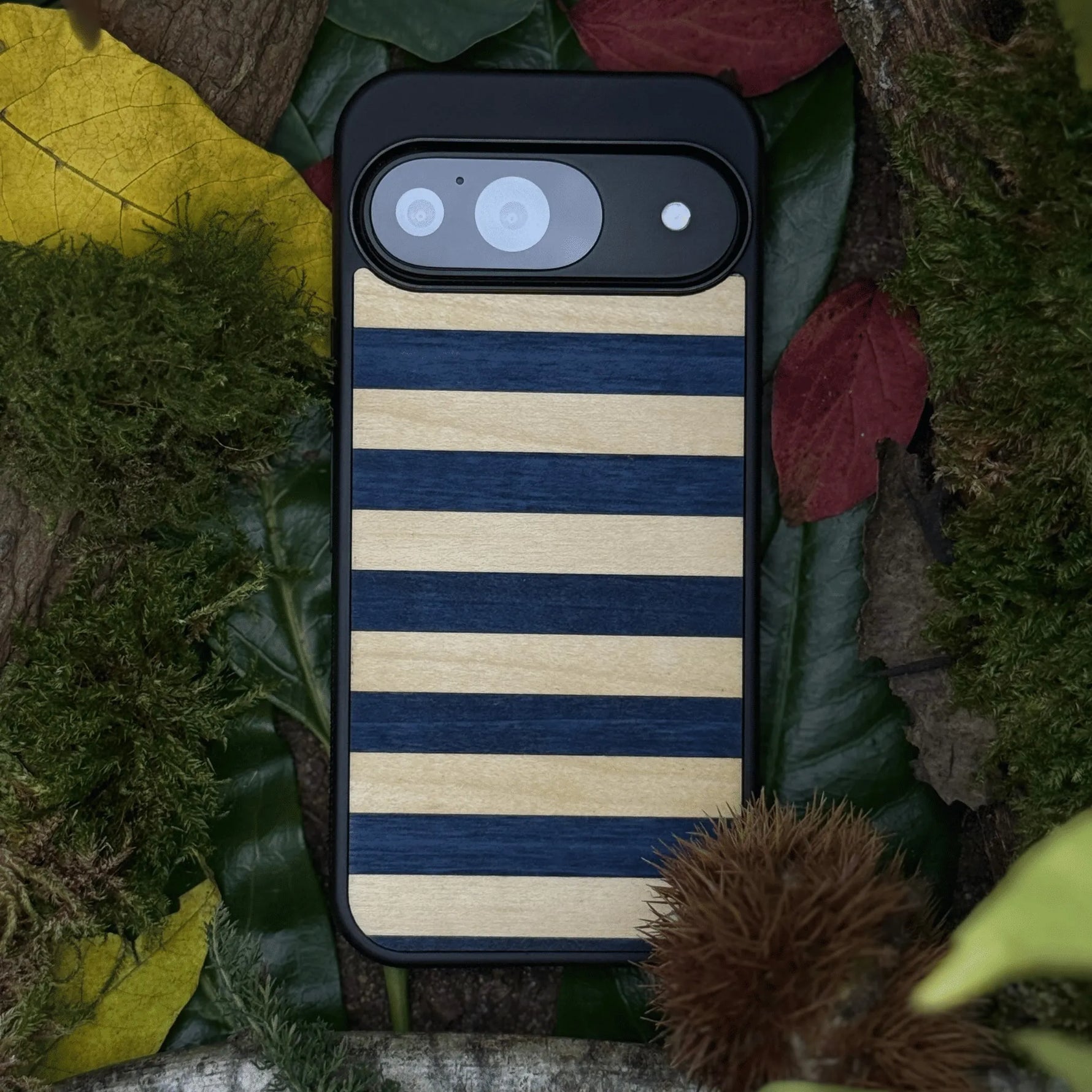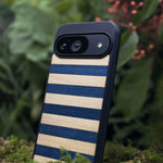 Coque de protection en bois véritable fabriquée en France pour Google Pixel 8 alliant plusieurs essences de bois pour représenter une marinière