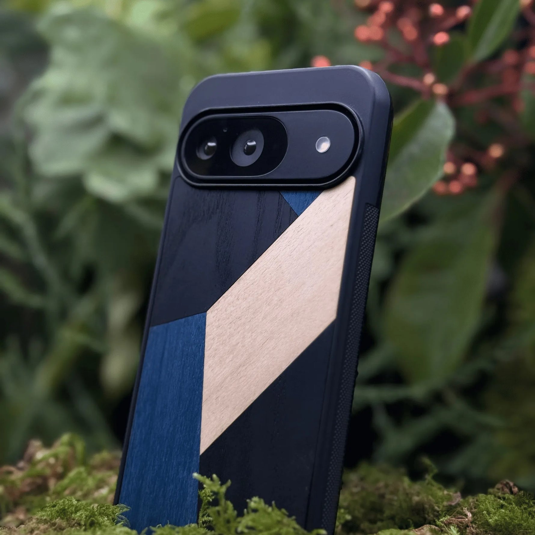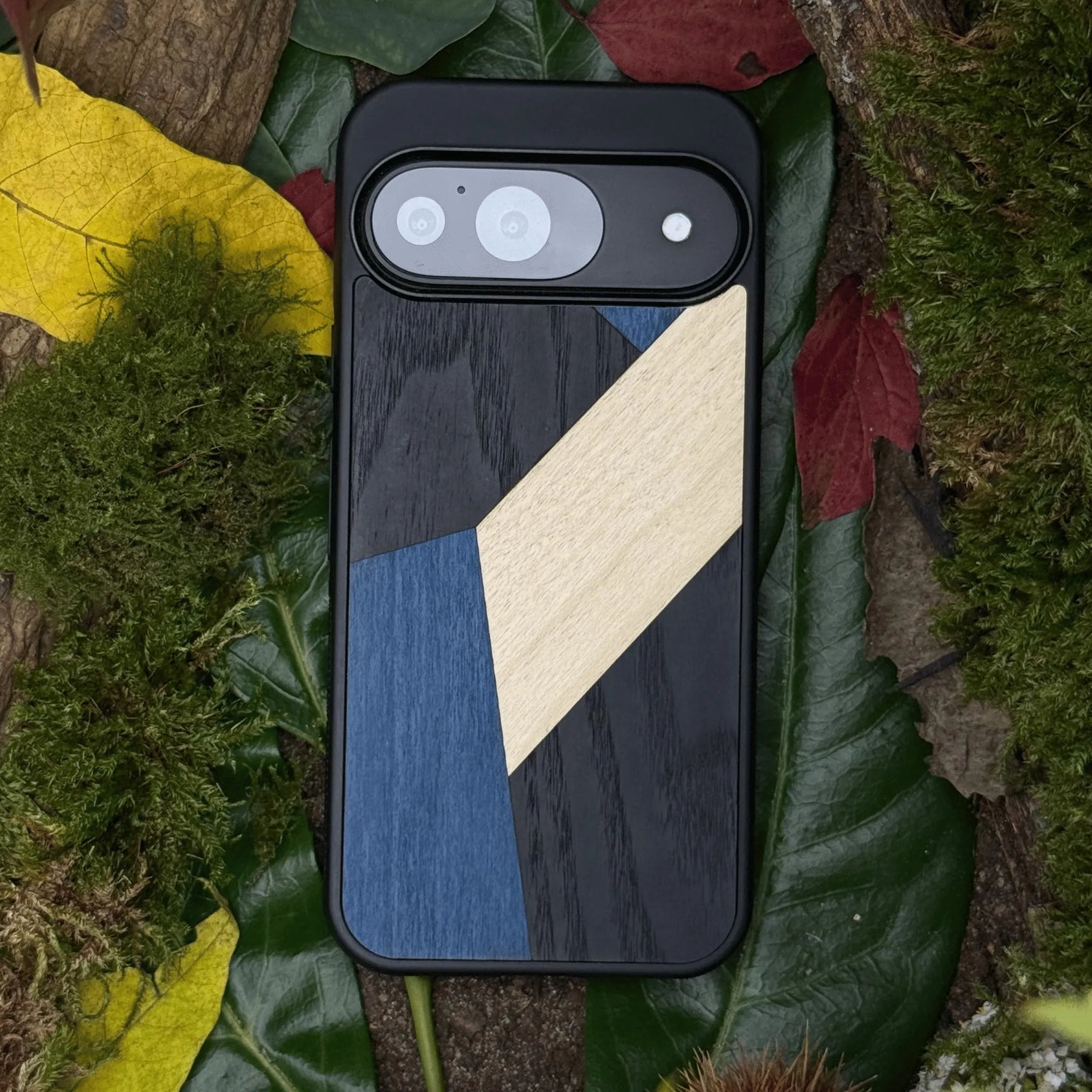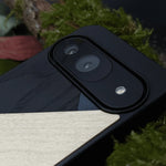 Coque de protection en bois véritable fabriquée en France pour Google Pixel 8 alliant du bambou, du tulipier bleu et noir en forme de mosaïque minimaliste sur le thème de l'art abstrait
