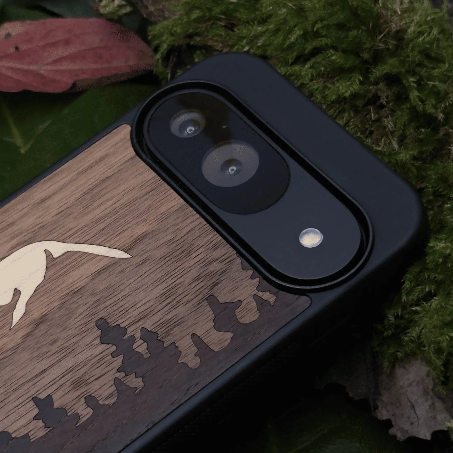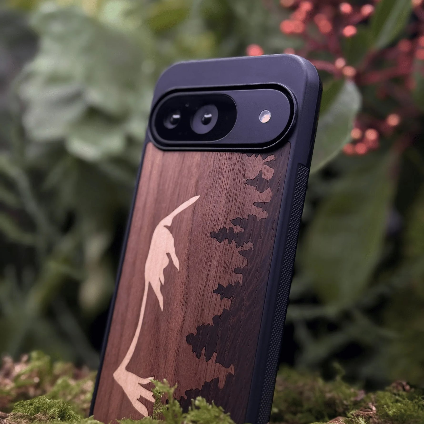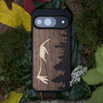 Coque de protection en bois véritable fabriquée en France pour Google Pixel 9 sur le thème de la nature et de la montagne qui allie du chêne fumé, du noyer et du bambou représentant le mont mézenc