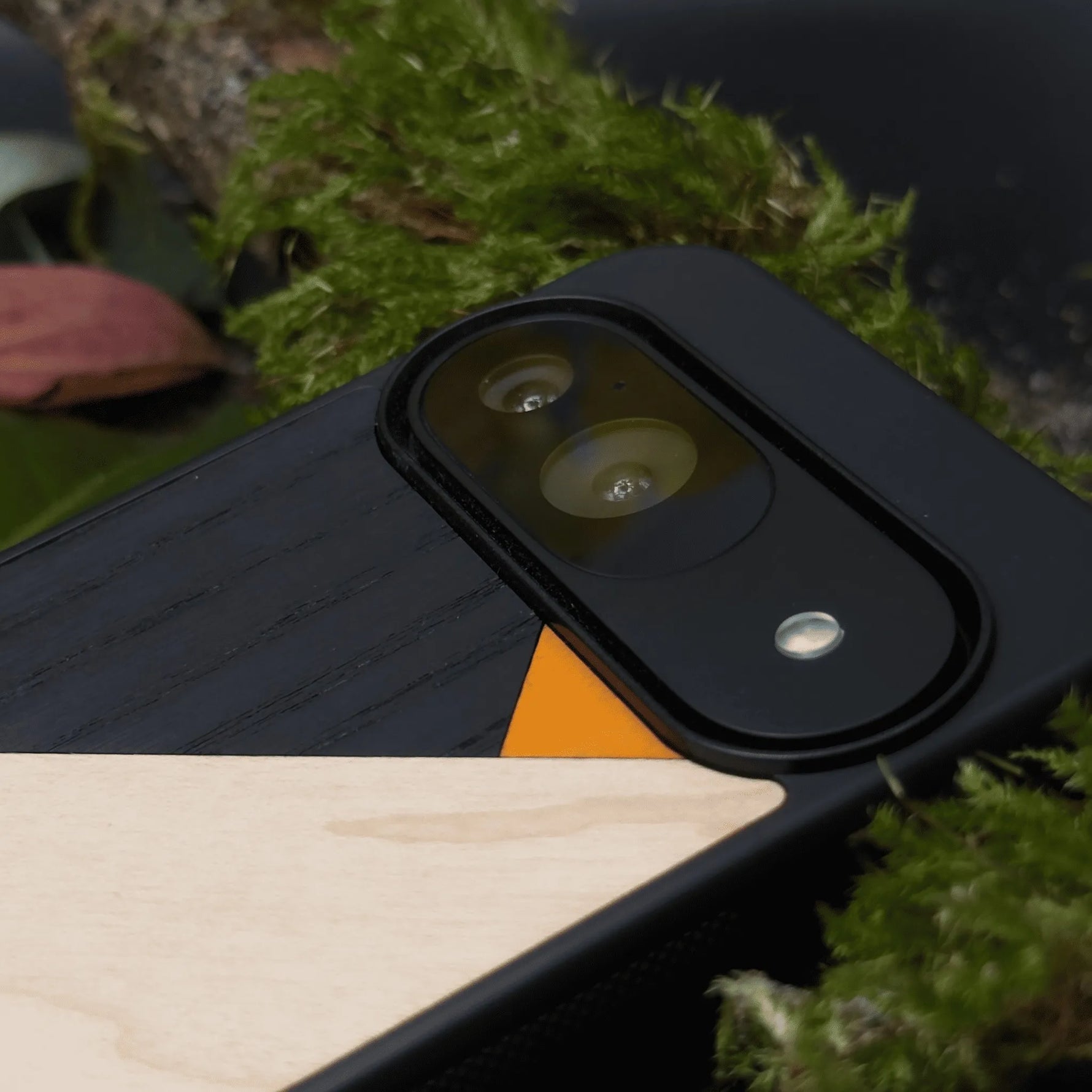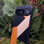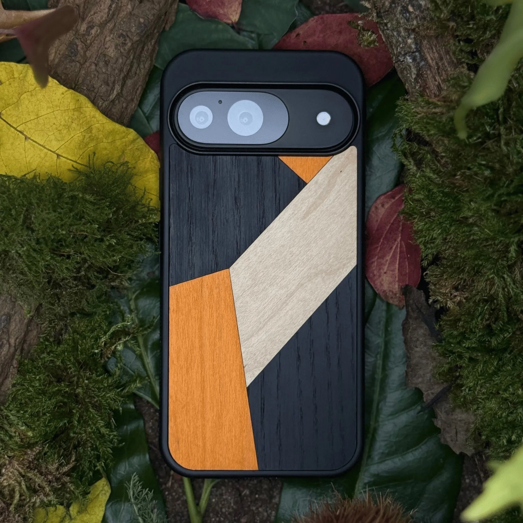 Coque de protection en bois véritable fabriquée en France pour Google Pixel 9 Pro alliant du bambou, du tulipier orange et noir en forme de mosaïque minimaliste sur le thème de l'art abstrait
