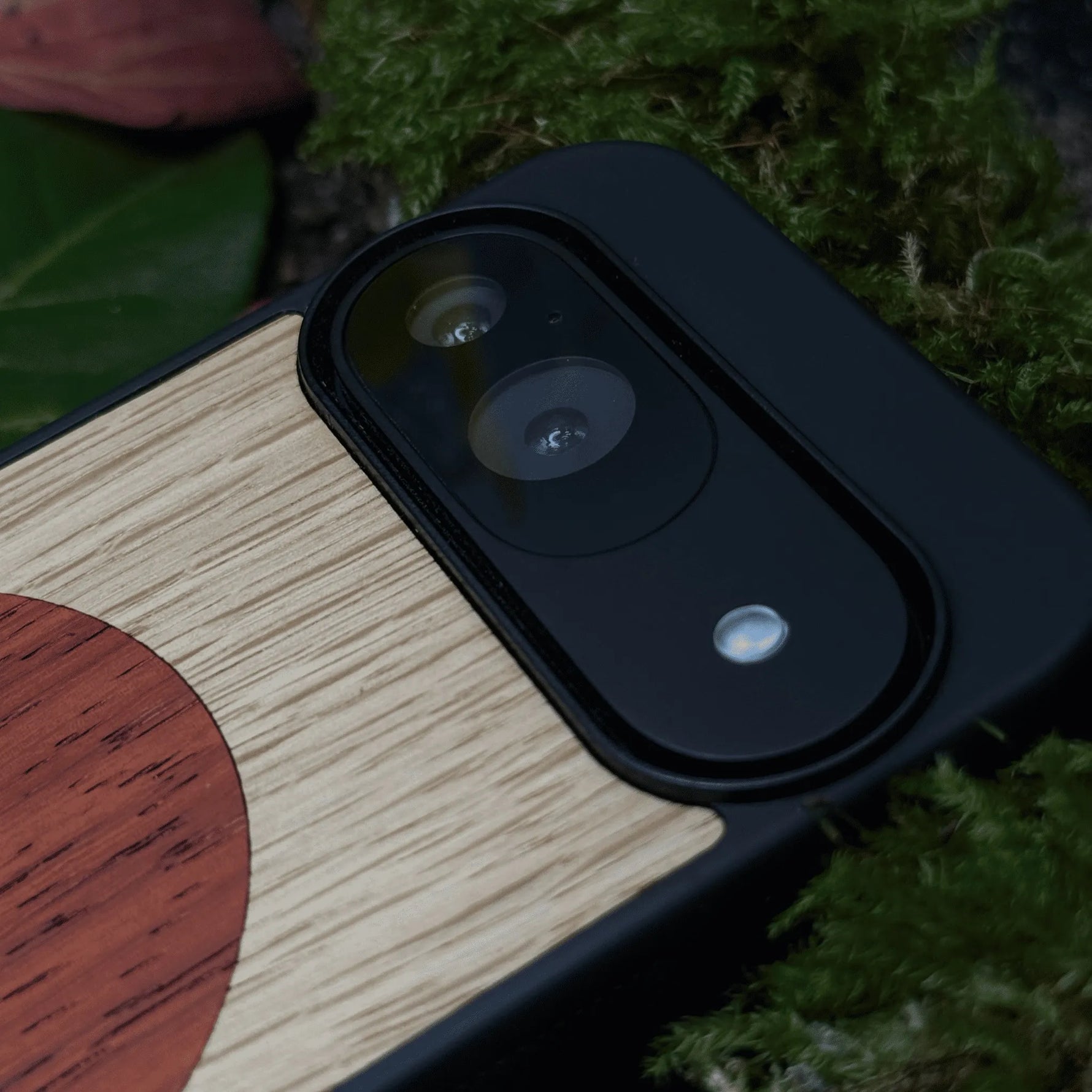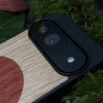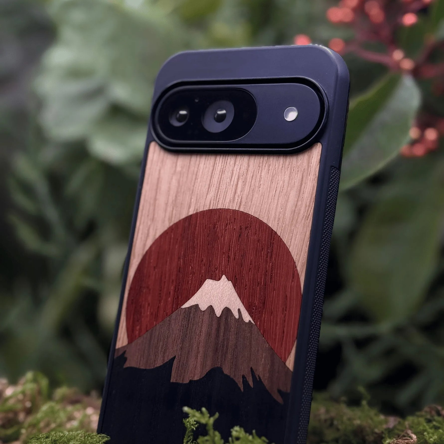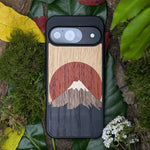 Coque de protection en bois véritable fabriquée en France pour Google Pixel 9A alliant plusieurs essences de bois pour représenter le mont Fuji