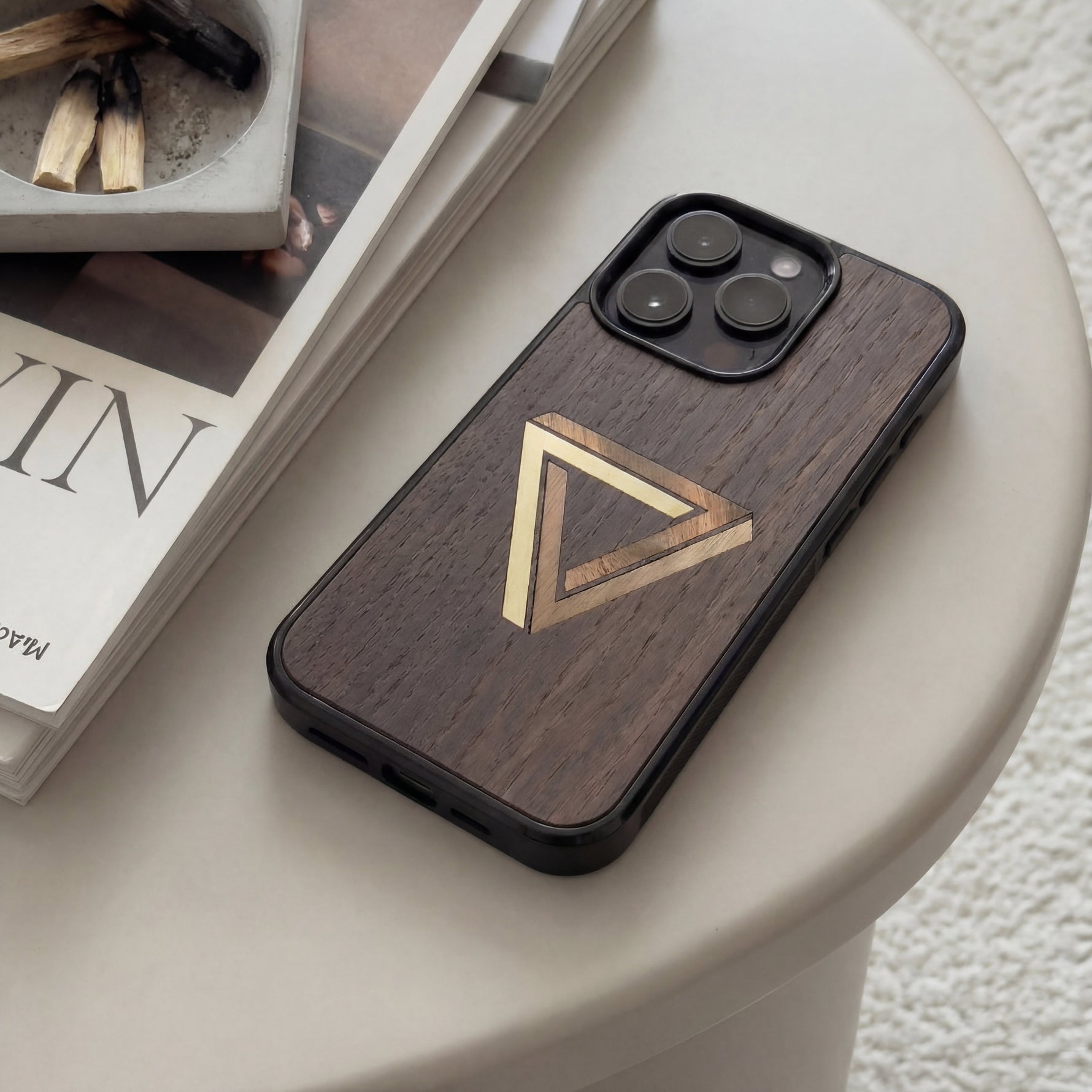 Coque de protection en bois véritable fabriquée en France pour Samsung A26 5G sur le thème de l'art géométrique qui allie du chêne fumé, du noyer, du bambou et du padouk représentant le triangle de penrose