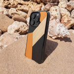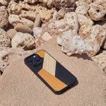 Coque de protection en bois véritable fabriquée en France pour Samsung A26 5G alliant du bambou, du tulipier orange et noir en forme de mosaïque minimaliste sur le thème de l'art abstrait