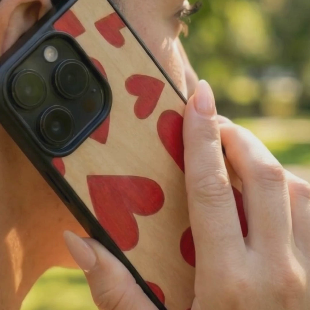 Coque de protection en bois véritable fabriquée en France pour Samsung A26 5G alliant plusieurs essences de bois pour représenter des coeurs pour les amoureux