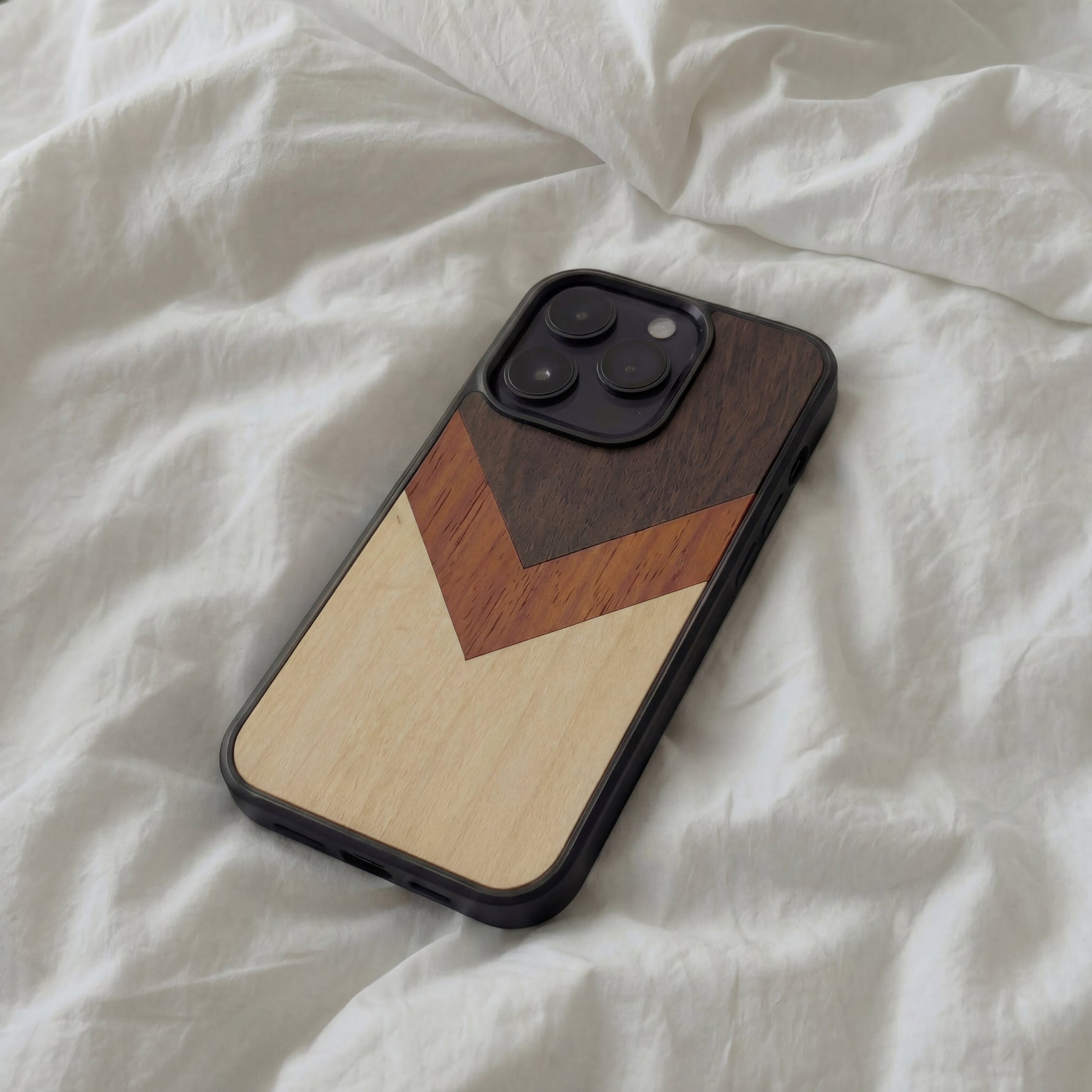 Coque de protection en bois véritable fabriquée en France pour Samsung A56 5G alliant du chêne fumé, du padouk et du bambou en forme de chevron sur le thème de l'art abstrait