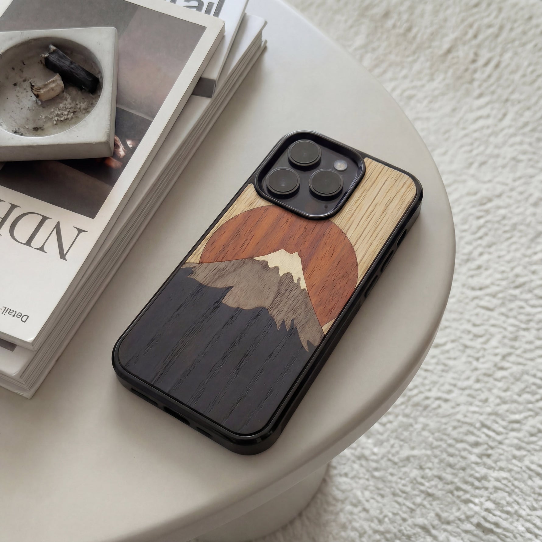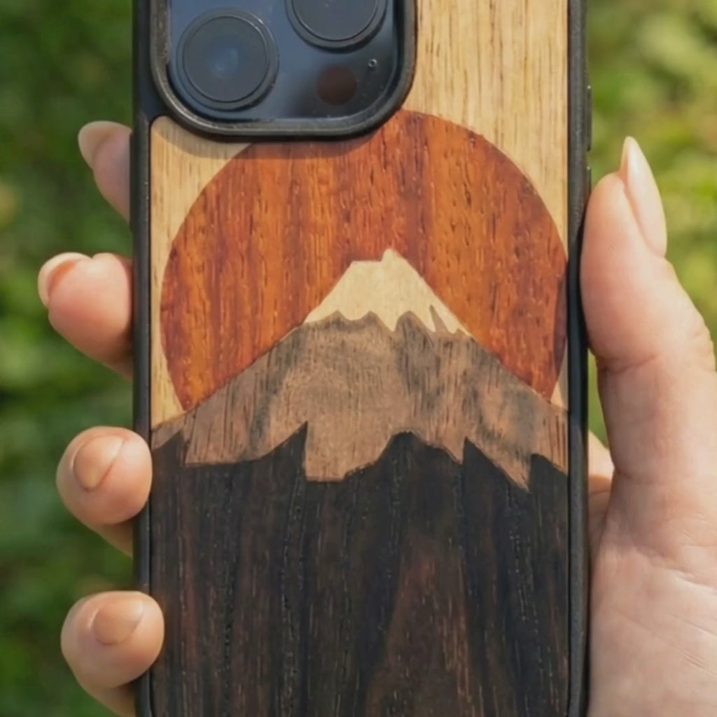 Coque de protection en bois véritable fabriquée en France pour Samsung A56 5G alliant plusieurs essences de bois pour représenter le mont Fuji