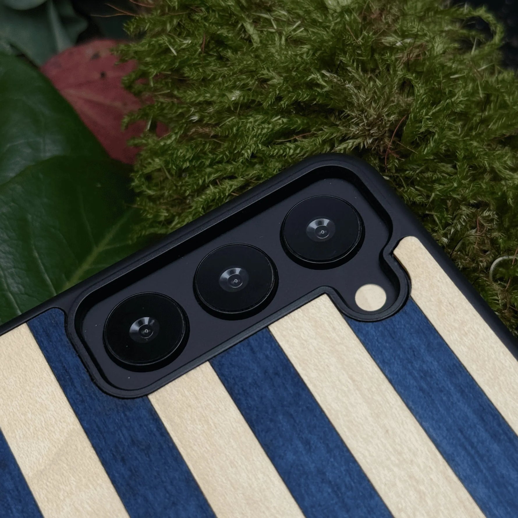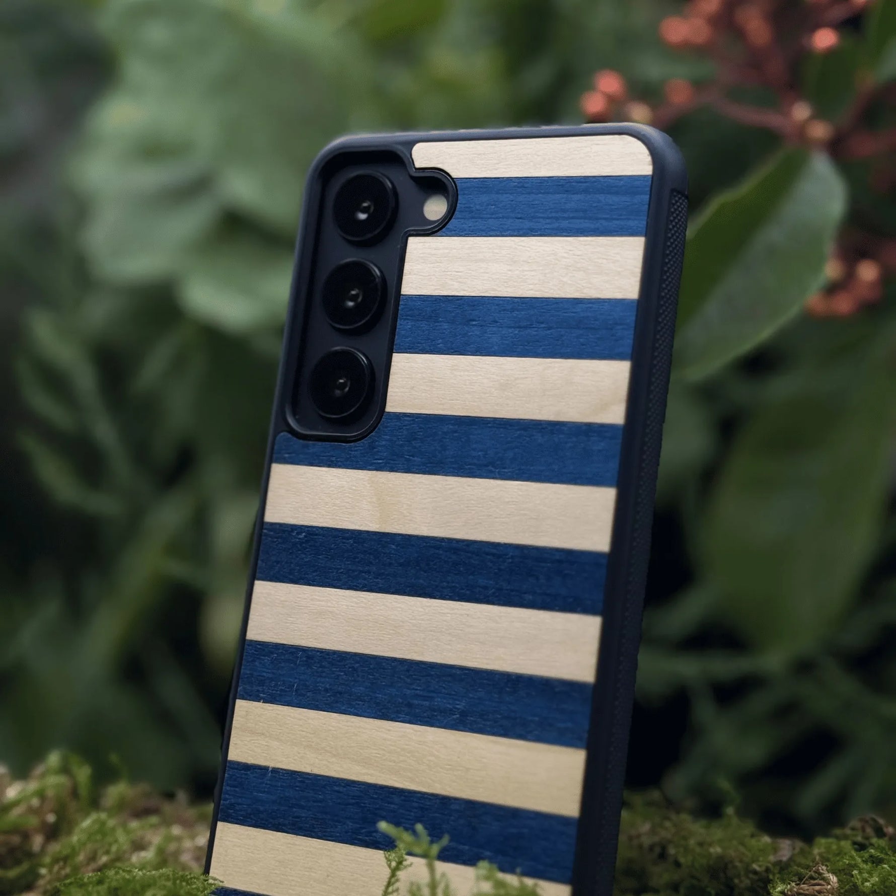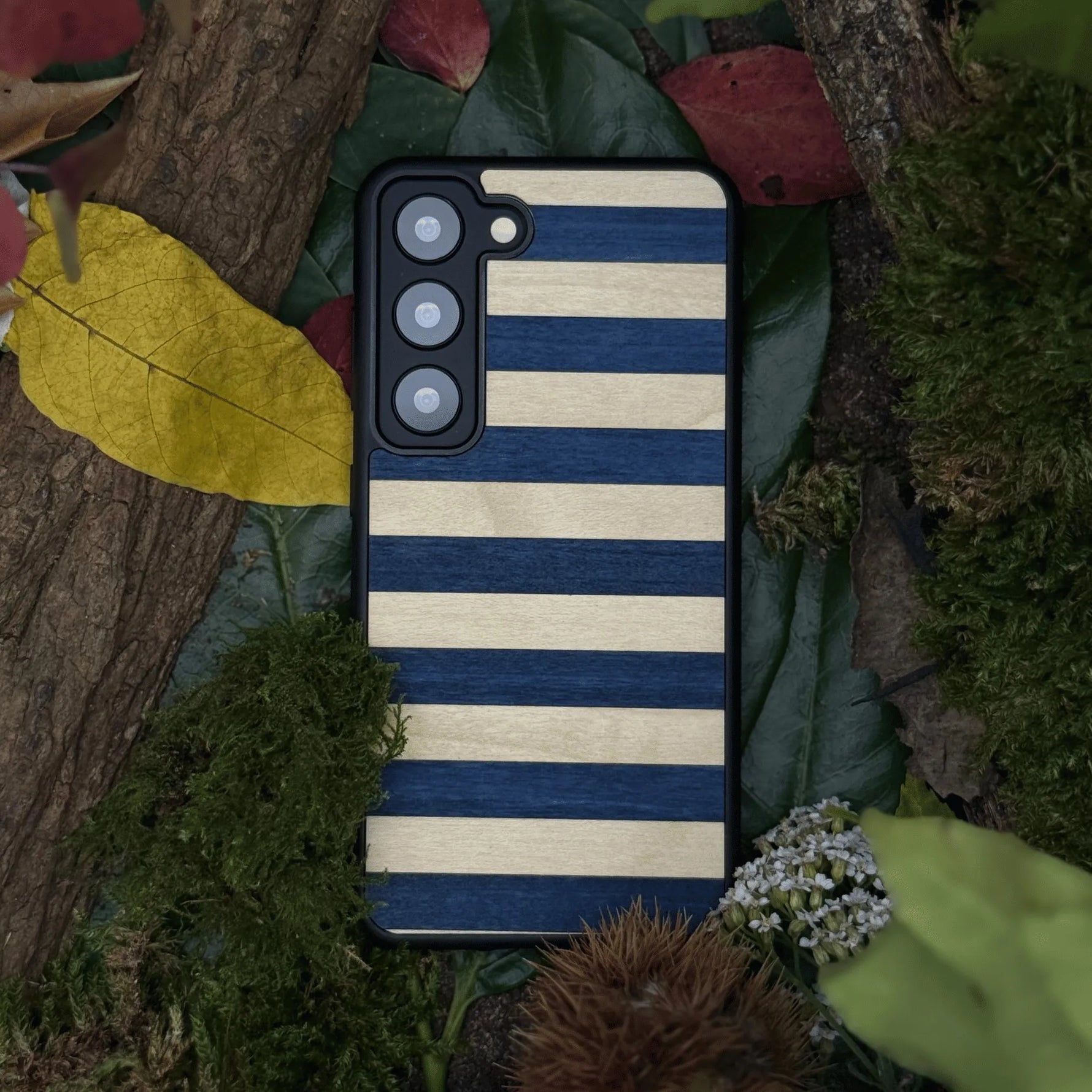 Coque de protection en bois véritable fabriquée en France pour Samsung S21 alliant plusieurs essences de bois pour représenter une marinière