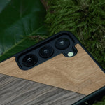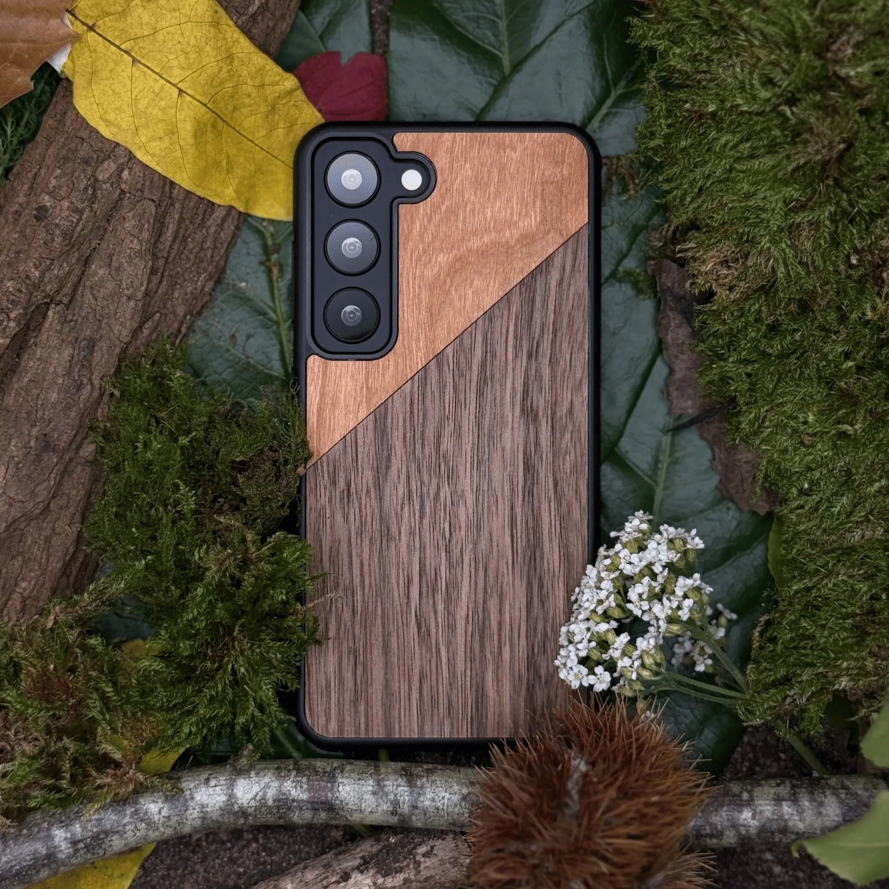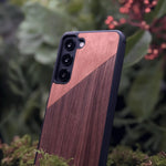 Coque de protection en bois véritable fabriquée en France pour Samsung S21 alliant du merisier et du noyer formant chacun un triangle avec une jointure en diagonale sur le thème de l'art abstrait