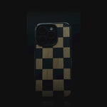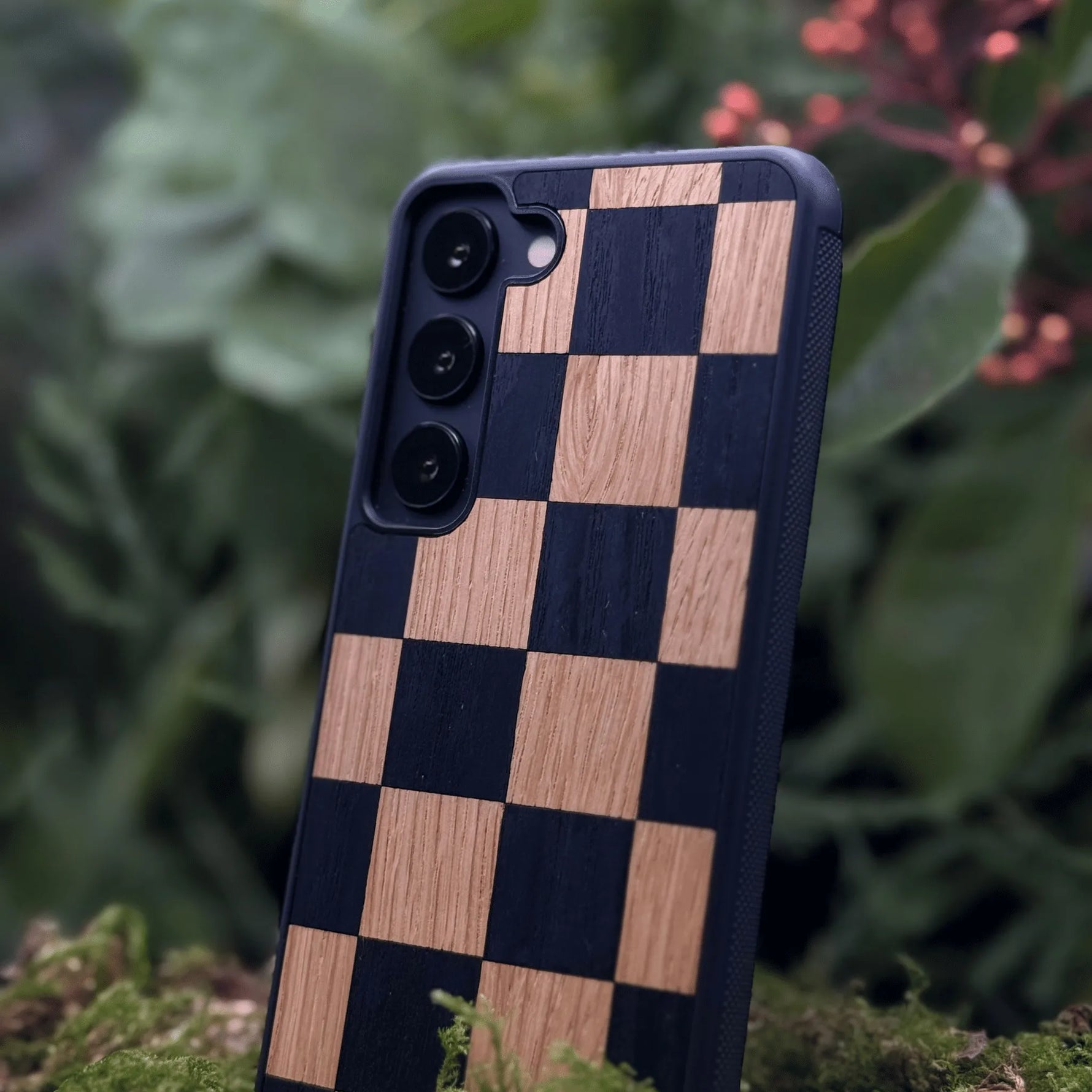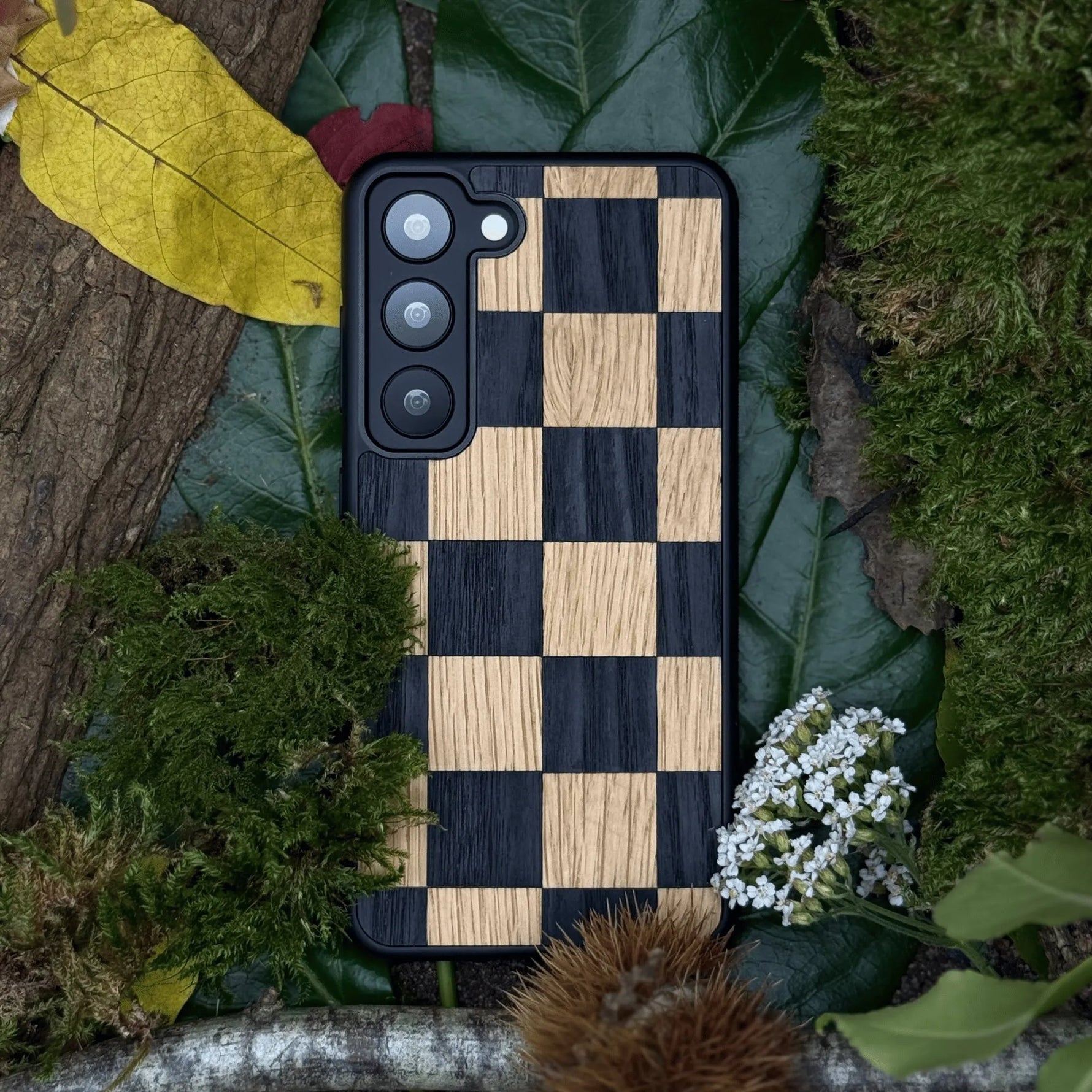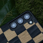 Coque de protection en bois véritable fabriquée en France pour Samsung S21FE alliant plusieurs essences de bois pour représenter un damier