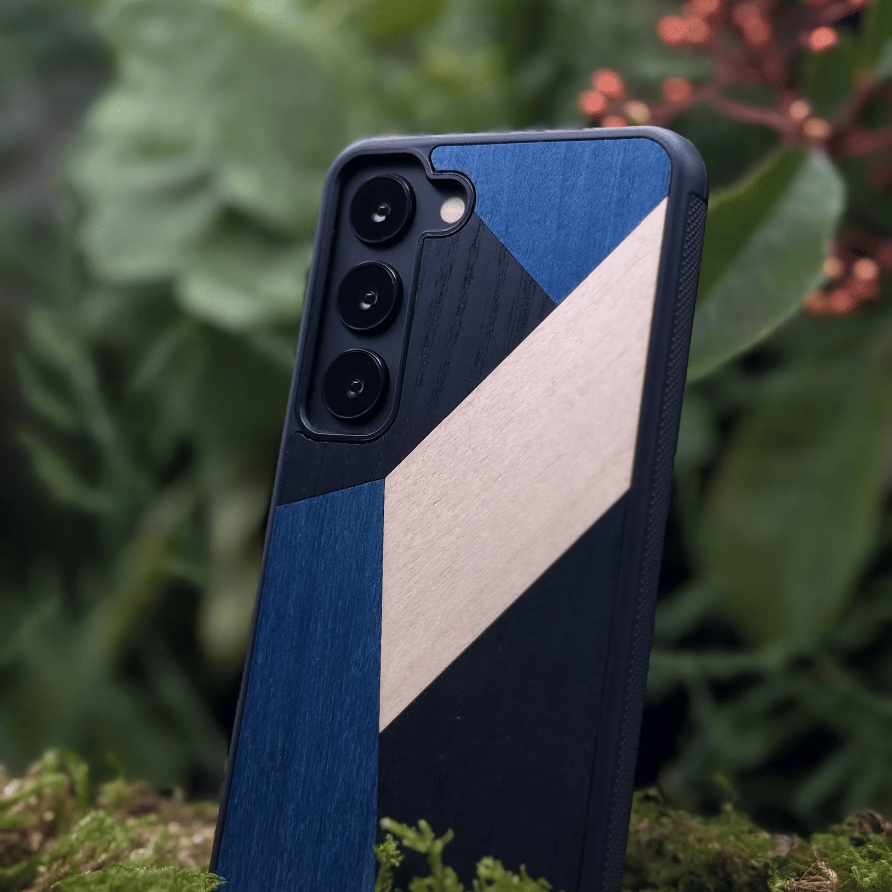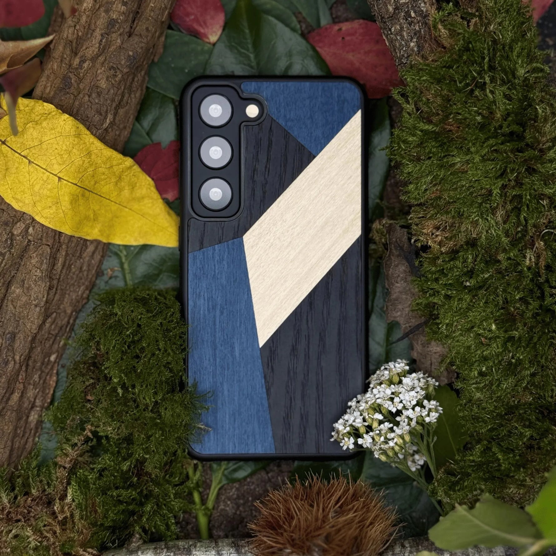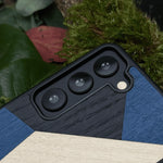Coque de protection en bois véritable fabriquée en France pour Samsung S21FE alliant du bambou, du tulipier bleu et noir en forme de mosaïque minimaliste sur le thème de l'art abstrait