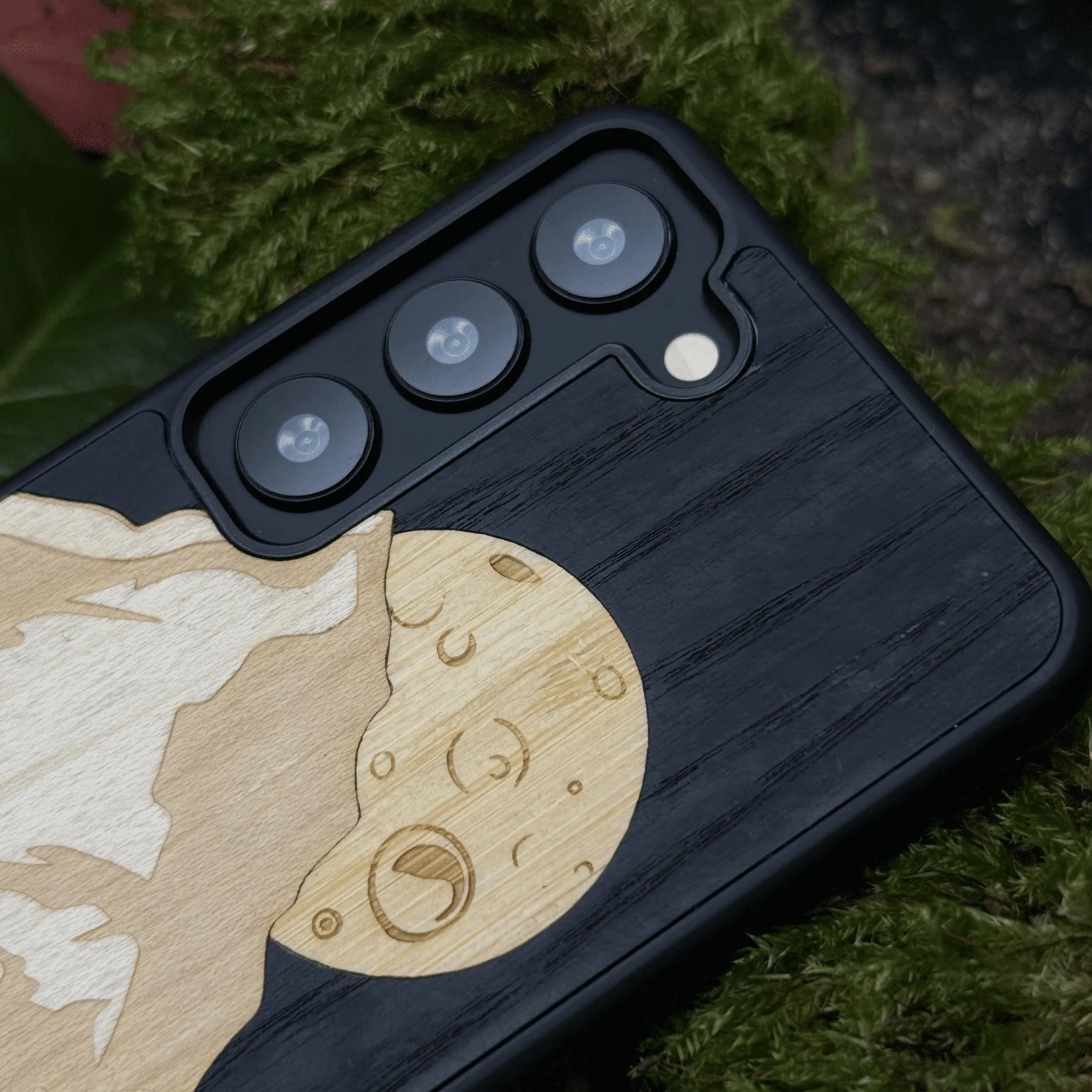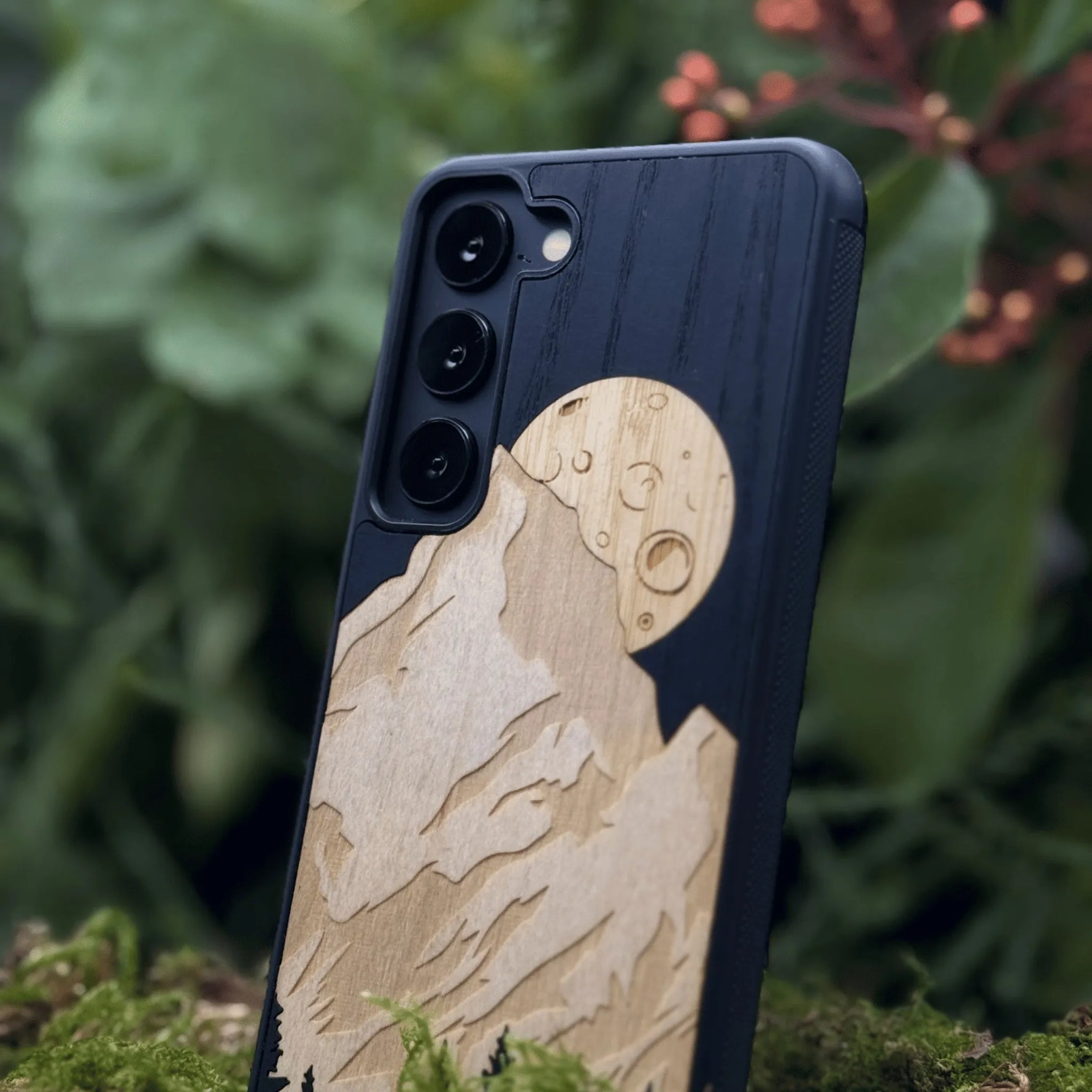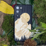 Coque de protection en bois véritable fabriquée en France pour Samsung S22+ alliant plusieurs essences de bois pour représenter le mont Everest