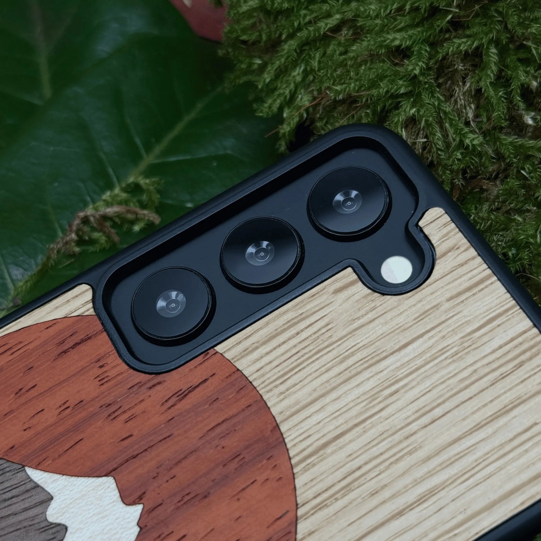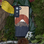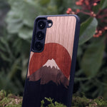 Coque de protection en bois véritable fabriquée en France pour Samsung S24FE alliant plusieurs essences de bois pour représenter le mont Fuji