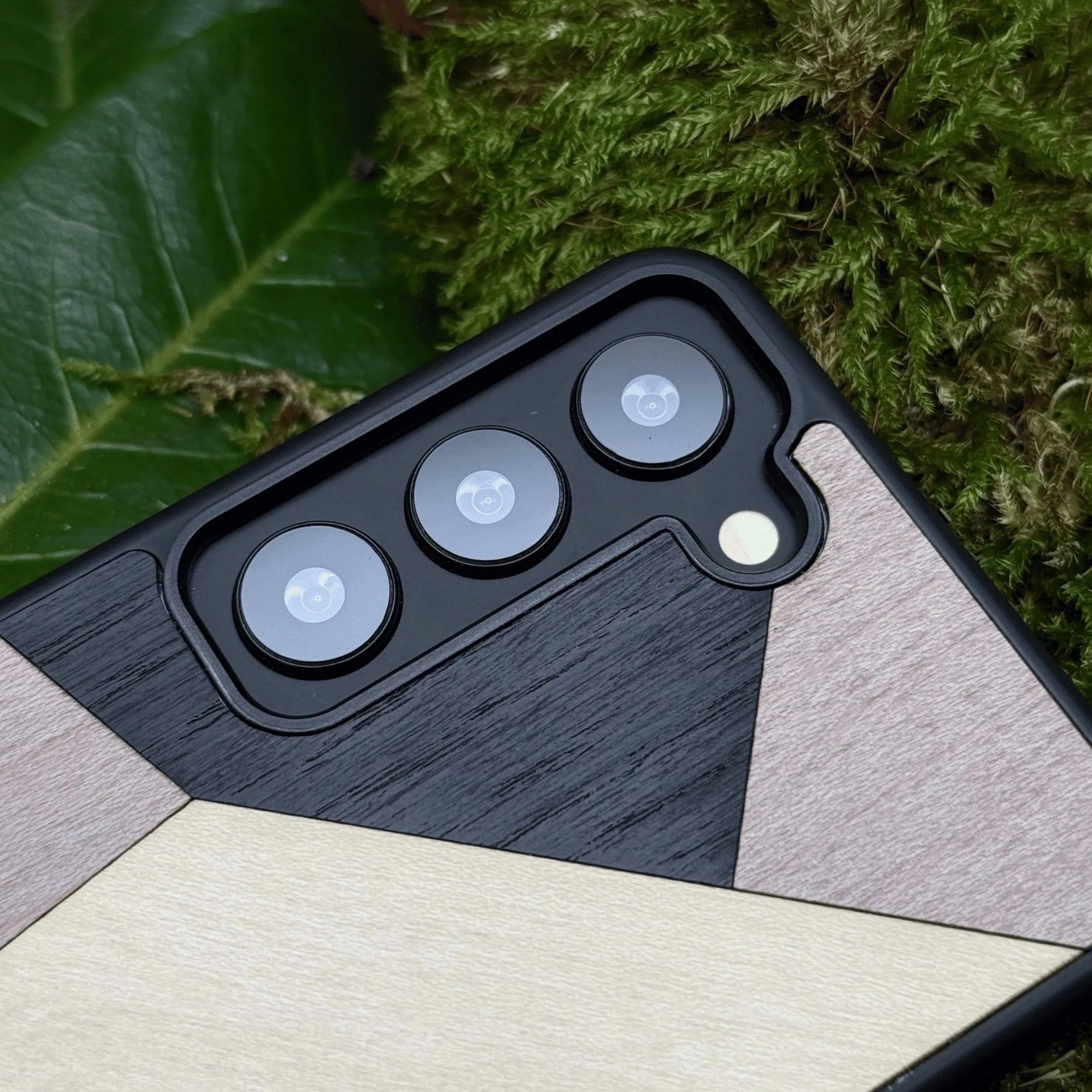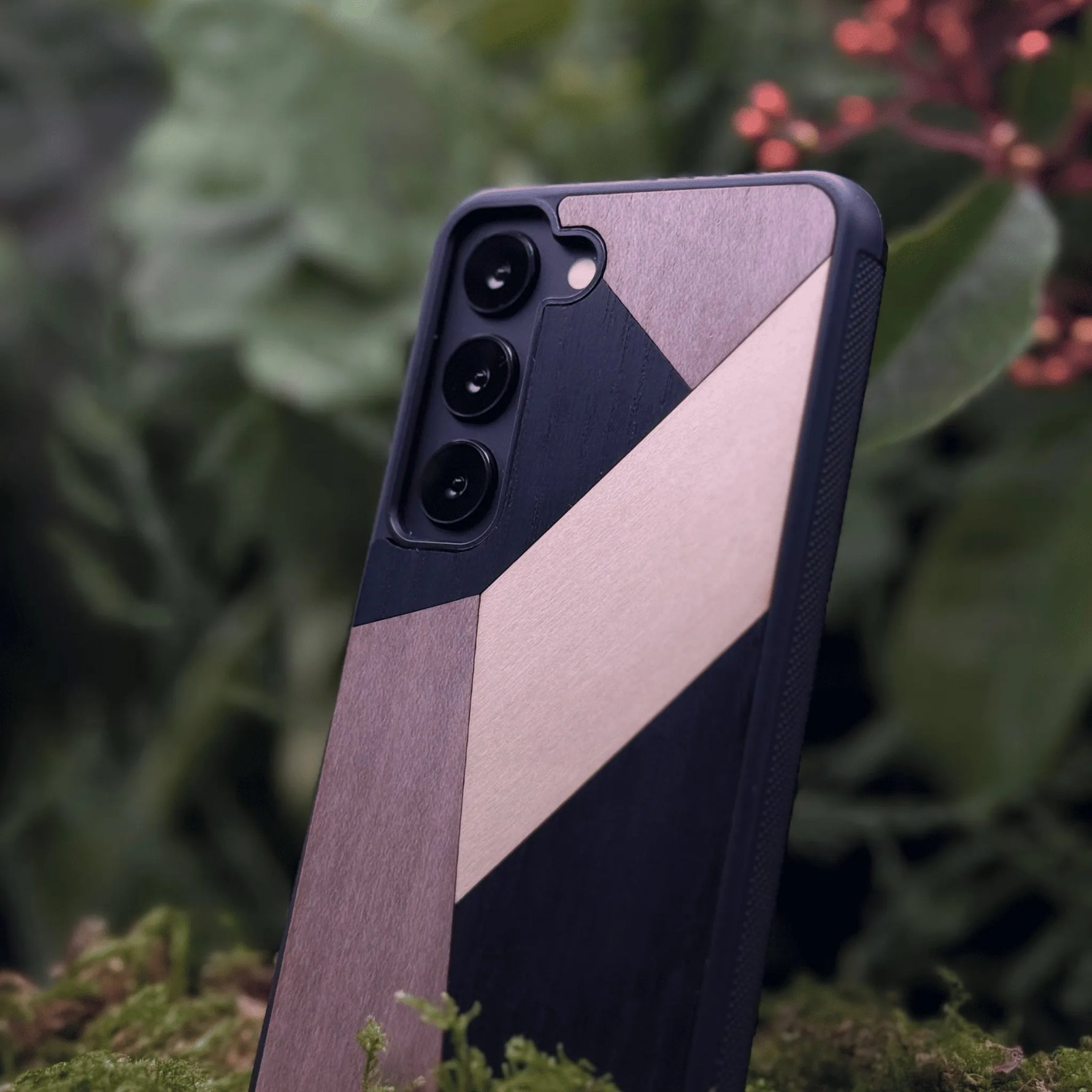Coque de protection en bois véritable fabriquée en France pour Samsung S24+ alliant du bambou, du tulipier mauve et noir en forme de mosaïque minimaliste sur le thème de l'art abstrait