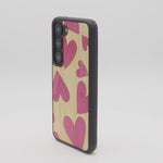 Coque de protection en bois véritable fabriquée en France pour Samsung S25 alliant plusieurs essences de bois pour représenter des coeurs pour les amoureux